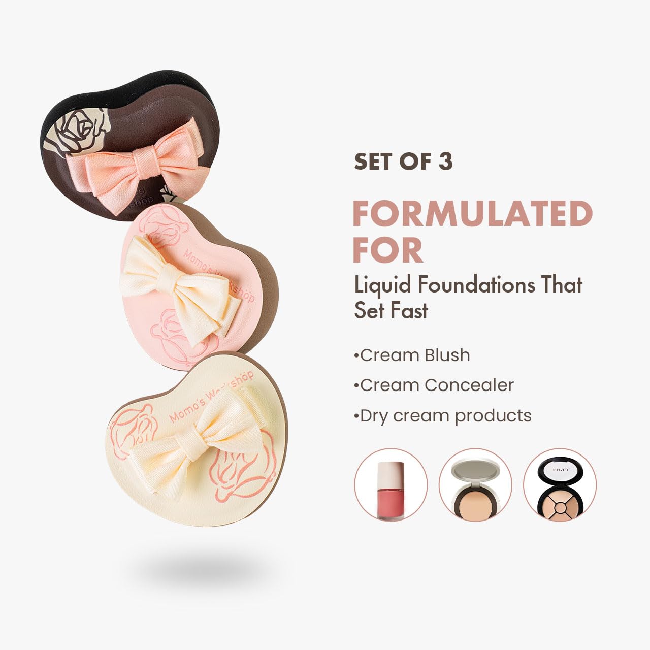 Heart-Shaped Makeup Sponge,Firm Bounce Rubycell, Foundation Sponge with Bow Tie Strap, for Precision Blending of Concealer/Cream Products, 3-Colors,Travel Friendly & Reusable & Storage Case
