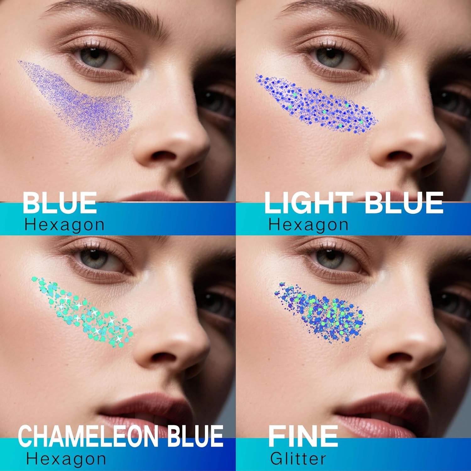 - 4 UNIQUE STYLES BLUE HAIR FACE GLITTER :Paminify Blue Face Glitter Gel comes in 4 stunning styles: blue hexagon glitter, fine shimmer, chameleon iridescent blue, and star glitter. Each adds a unique, eye-catching sparkle, perfect for creating mesmerizing rave festival and party looks