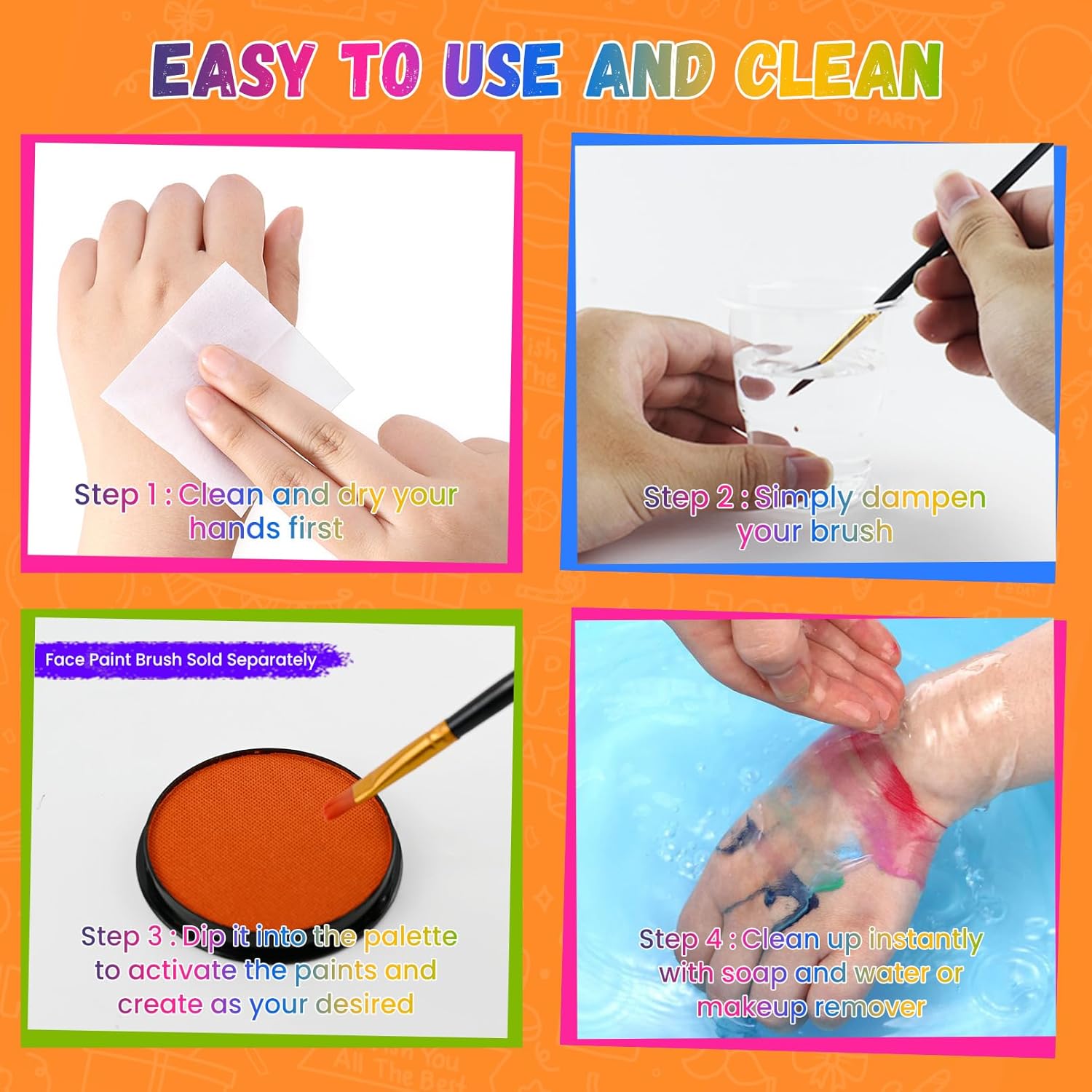 - Effortless Application & Removal: Create flawless face art with our water activated face paint: clean and dry your hands first and then simply dampen your brush and dip it into the palette to activate the paints, then create as your desired. Cleans up instantly with soap and water or makeup remover—no harsh scrubbing or staining residue. Before first use, we strongly recommend conducting a small patch test to ensure compatibility with your skin