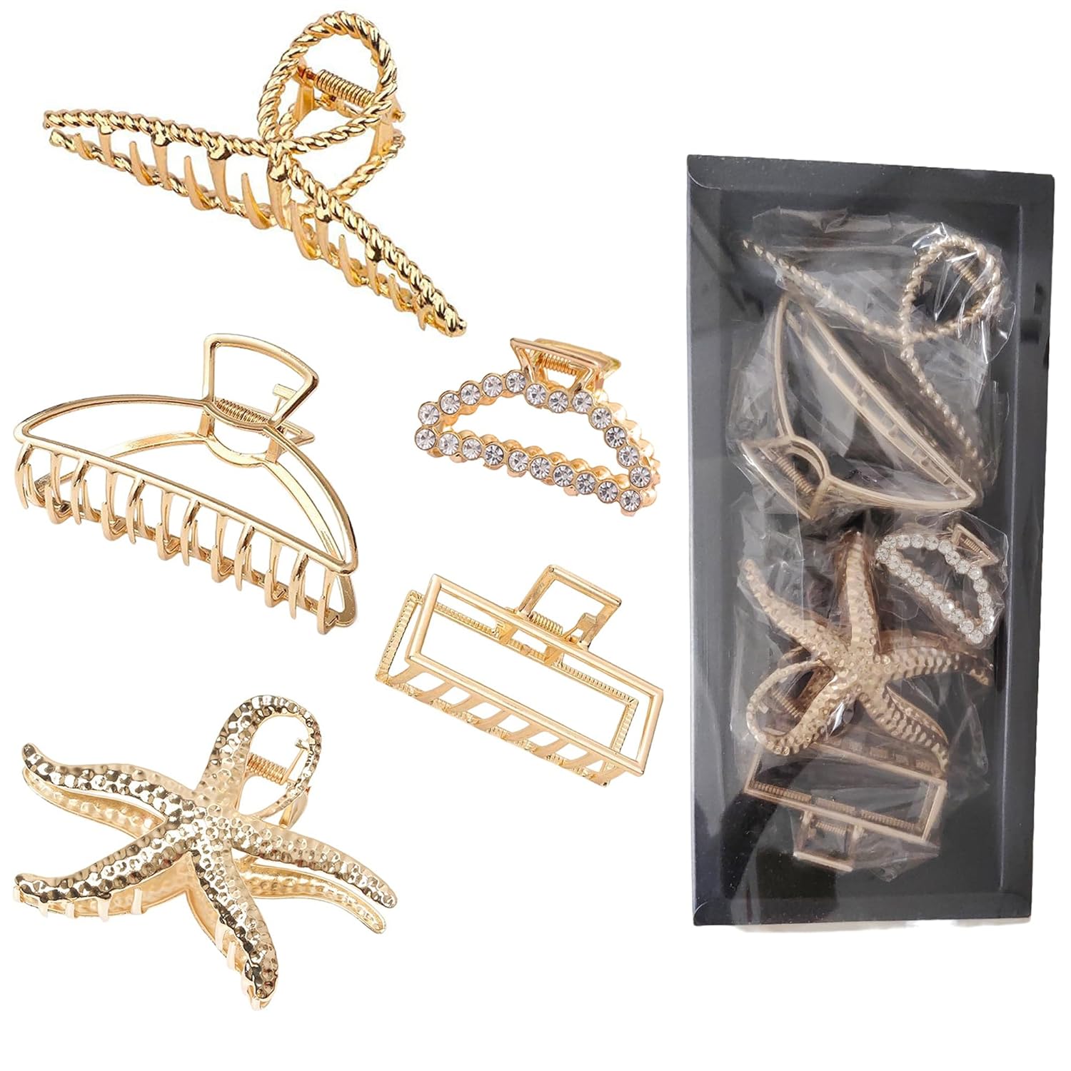 Elegant Hair Clips Set, 5 Piece Gold Metal Claw Clips with Crystal and Starfish Design, Large Size Hair Accessories for Women