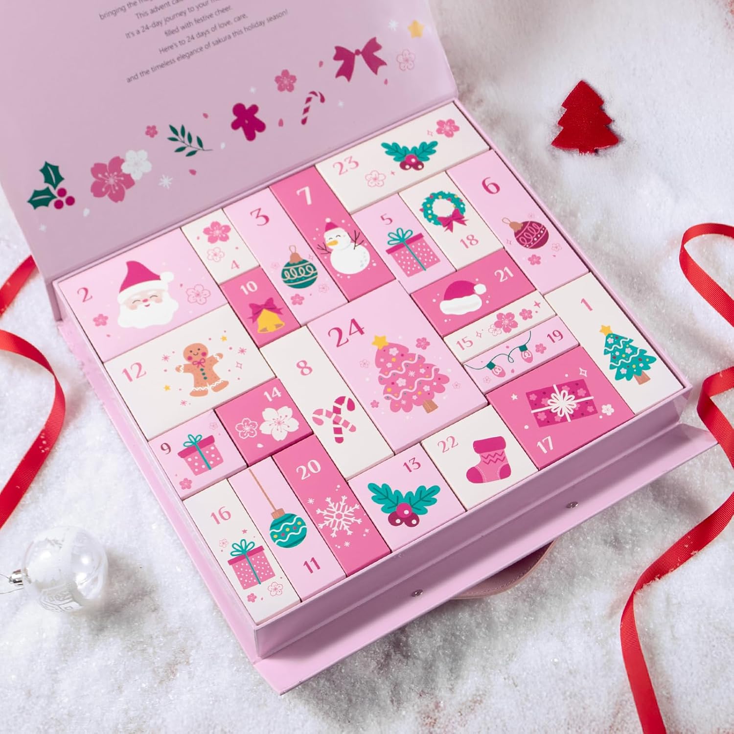 - The happiness and warmth of Christmas - This Advent Calendar set includes: Japan sakura hand soap sheet, hand cream, heel stick, foot cream, neck firming balm, bubble bath bomb, body wash, shampoo, hair conditioner, scented candle, Christmas stocking, lip mask, lip balm, cleanser, handmade soap, mud mask, night cream, toner, serum, day & night eye cream, day cream, exfoliating scrub, glow balm, serum capsules