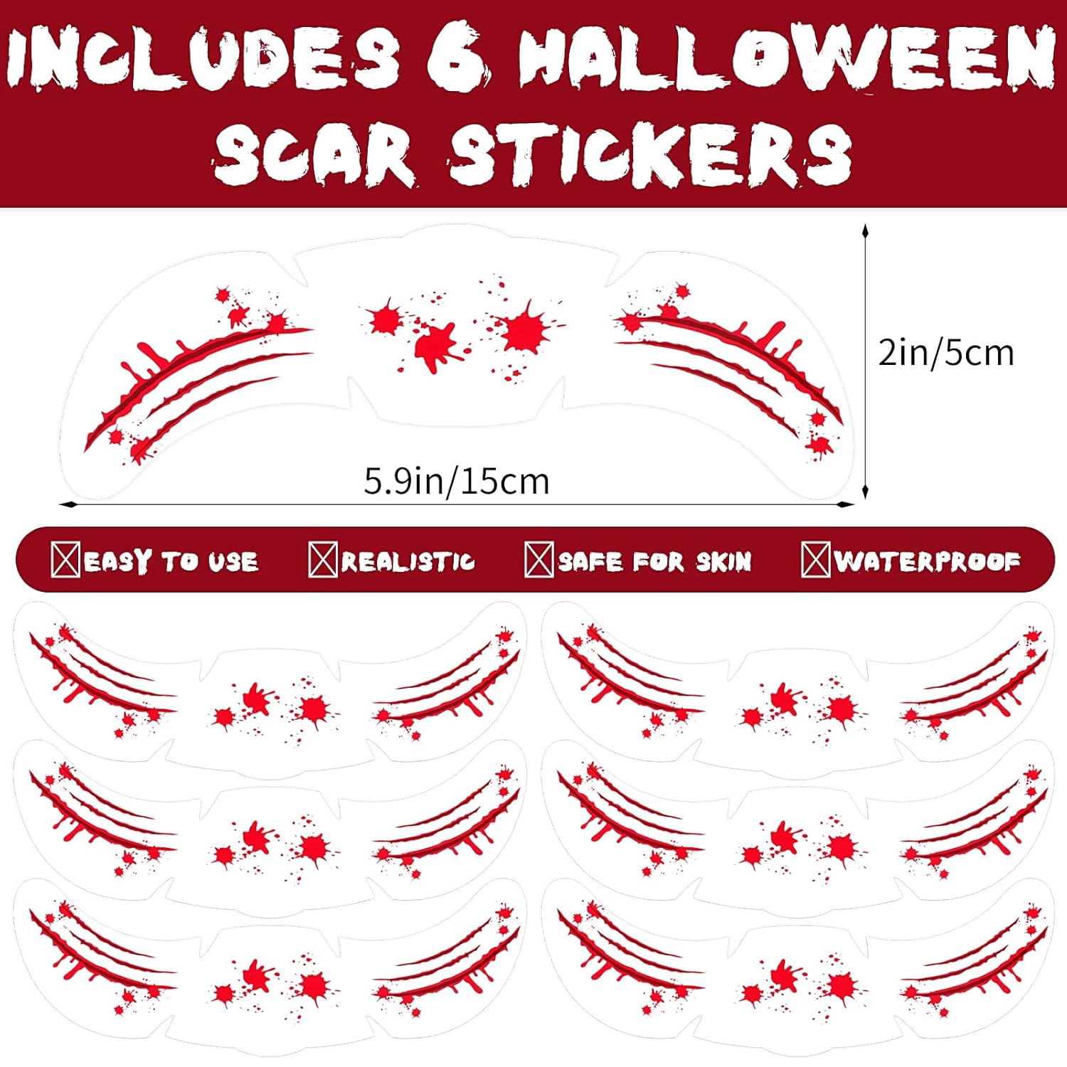 - Red Scars Tattoos: You will get 6 sheets of Halloween temporary tattoos. The pattern is big enough and realistic enoughone pack for all your needs. It is a trick to frighten friends used in cosplay, masquerade, or a Halloween party.