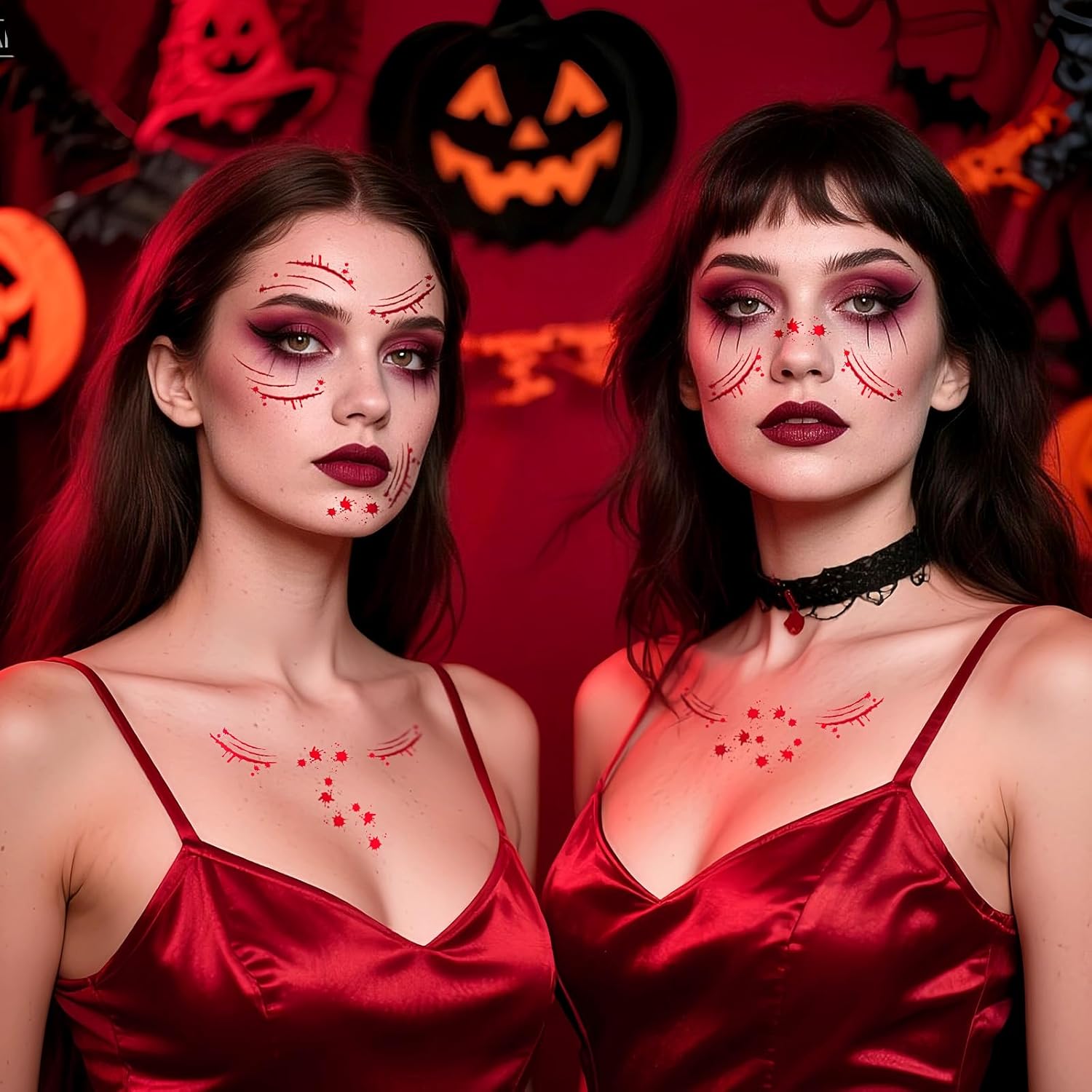 Halloween Wound Simulation Face Tattoo Stickers - Halloween Glitter Freckles Face Tattoo, Red Glitter Freckles Face Tattoo for Women Men 6p