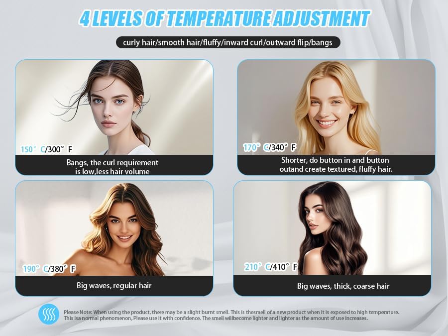 - [Suitable for All Hair Types and Lengths] This styling brush features a 1.5-inch keratin-coated barrel with four temperature settings (302-410°F / 150-210°C) for fine, medium, and coarse hair. From bangs to crown, effortlessly create sleek straight hair, voluminous curls, or tousled roots