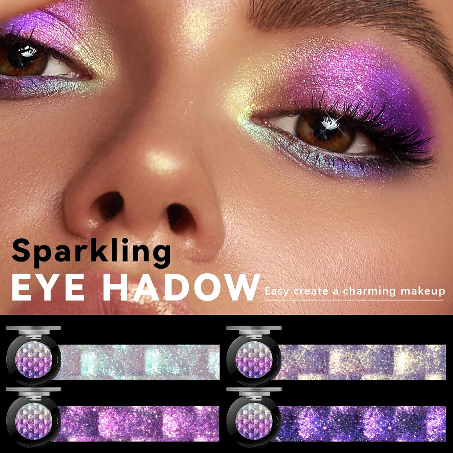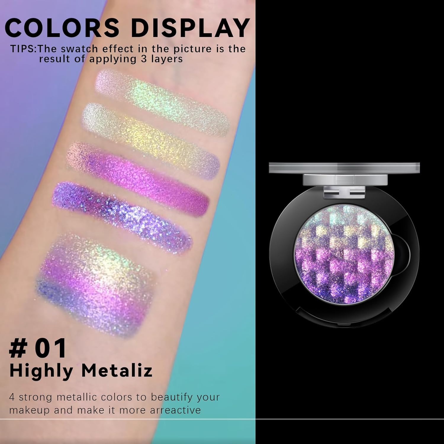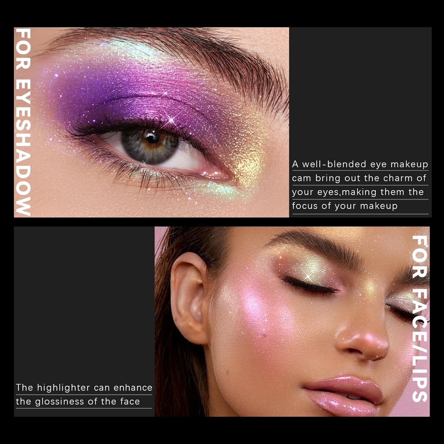 - 4 Colors Chameleon Eyeshadow: Blend of blue, gold, pink, and green shifts in one pan. Swipe once for a rainbow highlight, while building layers creates rich, vibrant intensity.Mix for a unique chameleon shimmer, brighten your skin tone and refract more colors at different angles to achieve holographic effect. The color payoff varies depending on application.