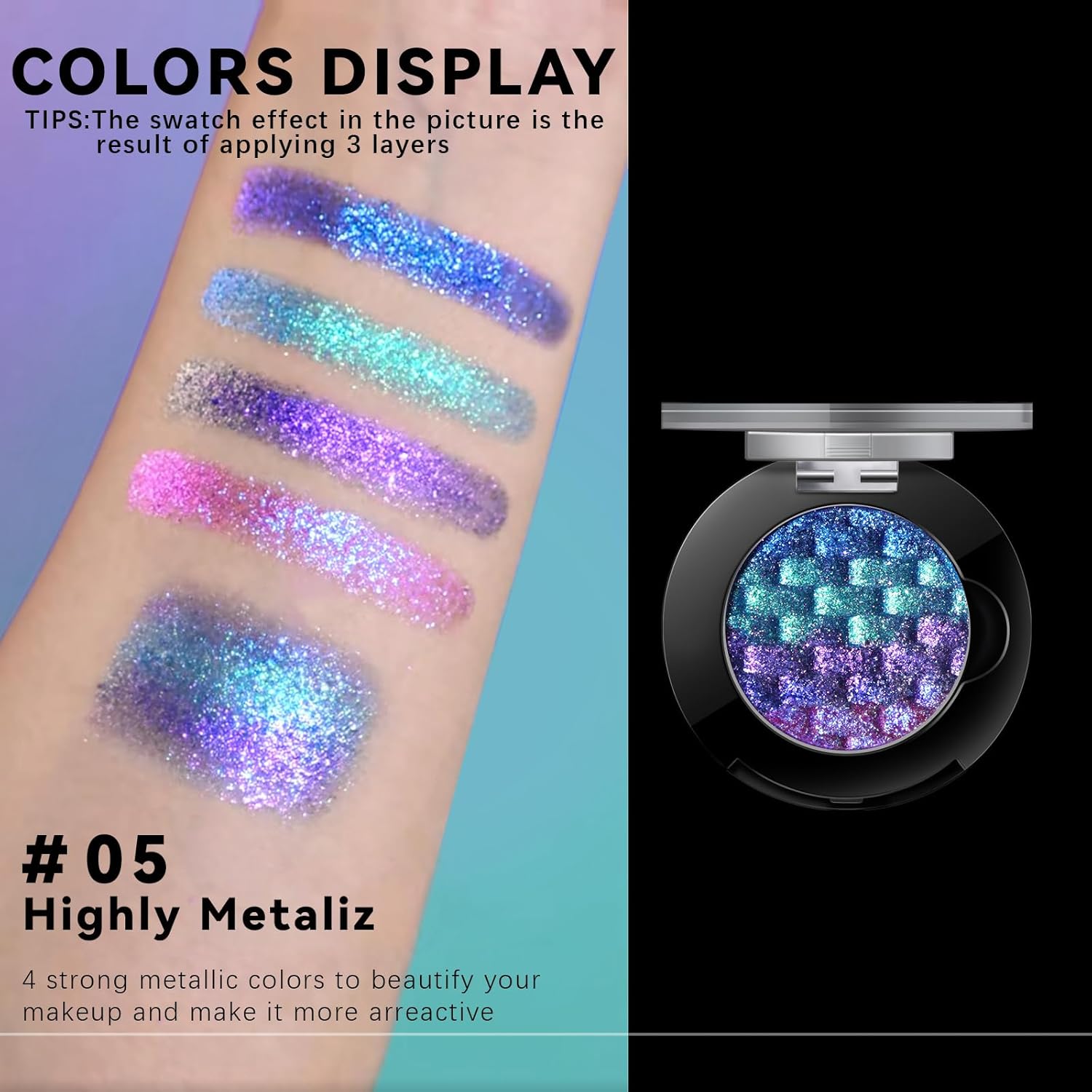 - 4 Colors Chameleon Eyeshadow: Blend of blue, gold, pink, and green shifts in one pan. Swipe once for a rainbow highlight, while building layers creates rich, vibrant intensity.Mix for a unique chameleon shimmer, brighten your skin tone and refract more colors at different angles to achieve holographic effect. The color payoff varies depending on application.