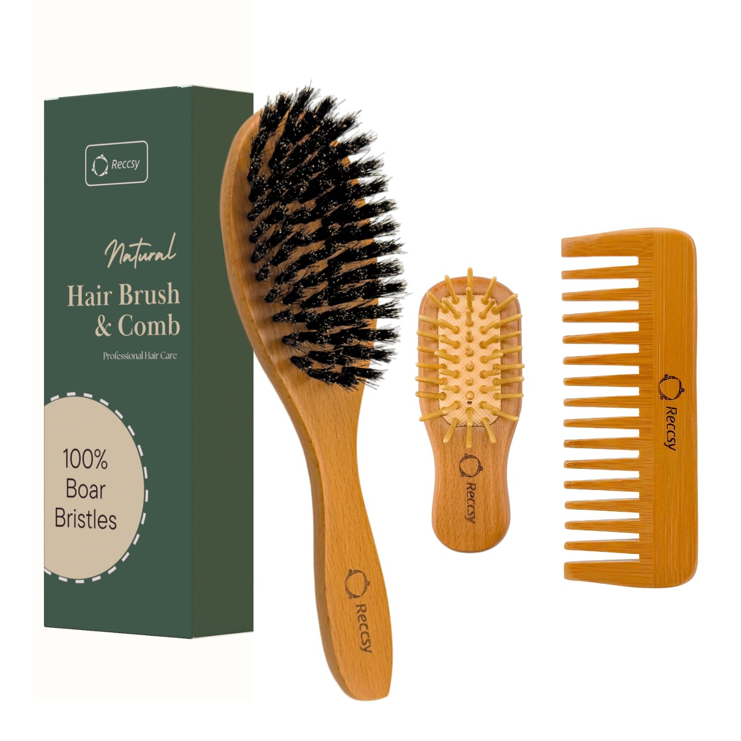 Boar Bristle Hair Brush Set For Women-100% Natural Boar Bristle Brush+Small Travel HairBrush+Bamboo Wide Tooth Comb For Thick Curly Thin Hair Smoothing Massaging Detangling. Restore Shine And Texture.