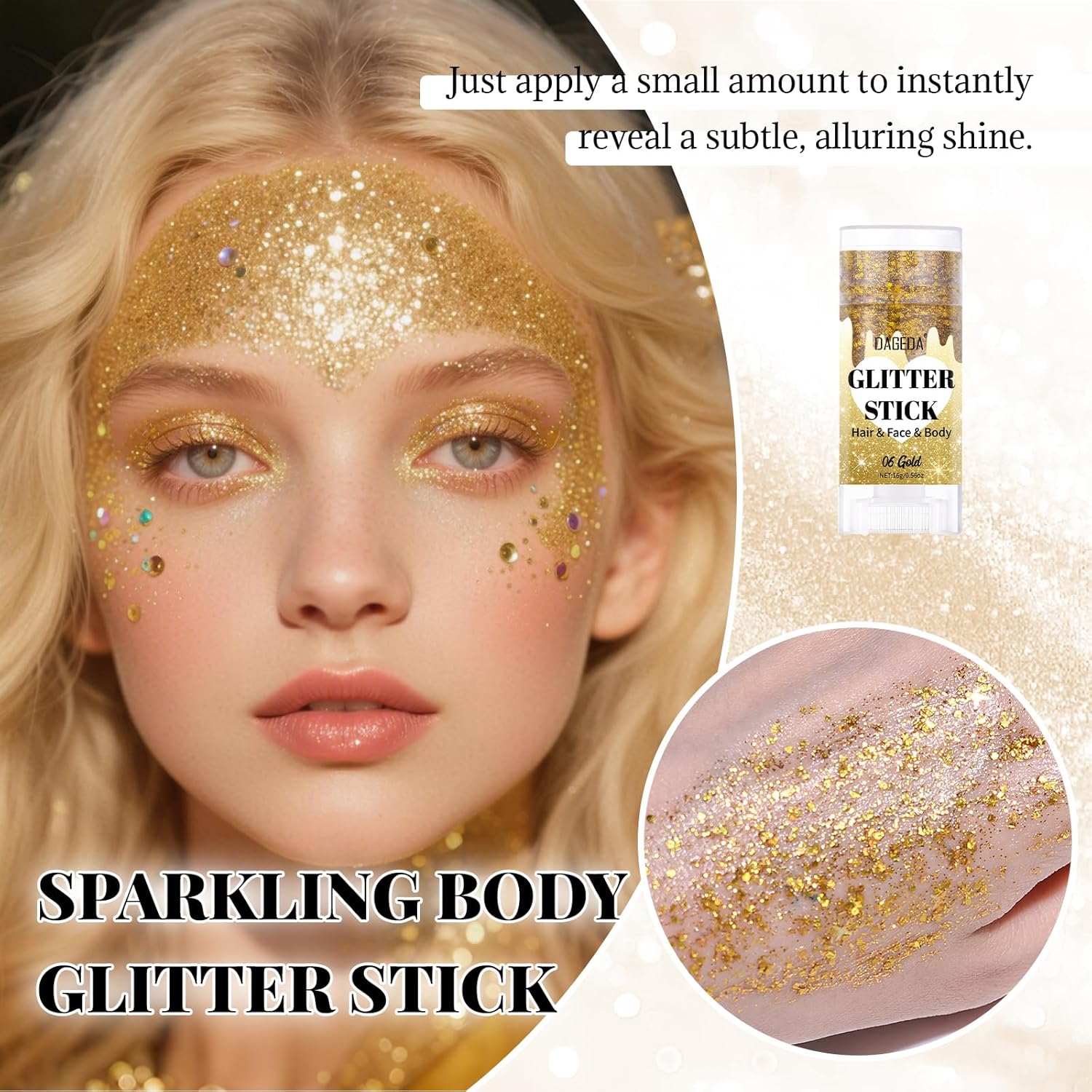 - Sparkly Glitter Makeup:DAGEDA gold face glitter stick is packed with rich chunky glitter particles and dotted with star-shaped glitter flakes that sparkle uniquely in the light. Just apply a small amount to instantly reveal a subtle, charming glow, making your rave party night even more dazzling.It is a gold glitter makeup suitable for women and girls.