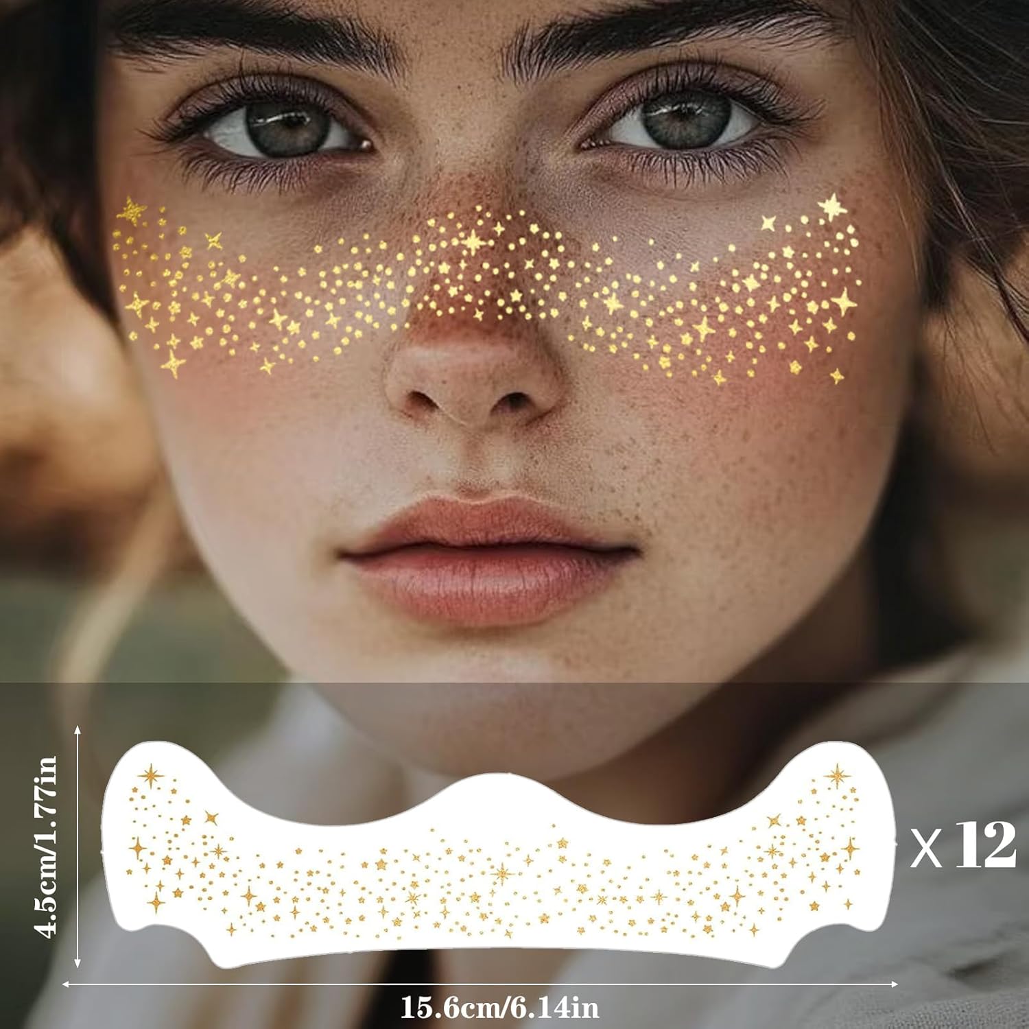 Glitter Freckles, Holographic Face and Body Glitter Tattoo Sparkle for Women Gold Glow Cosmetic Star Makeup Accessories for Festival Rave (12pcs Gold)