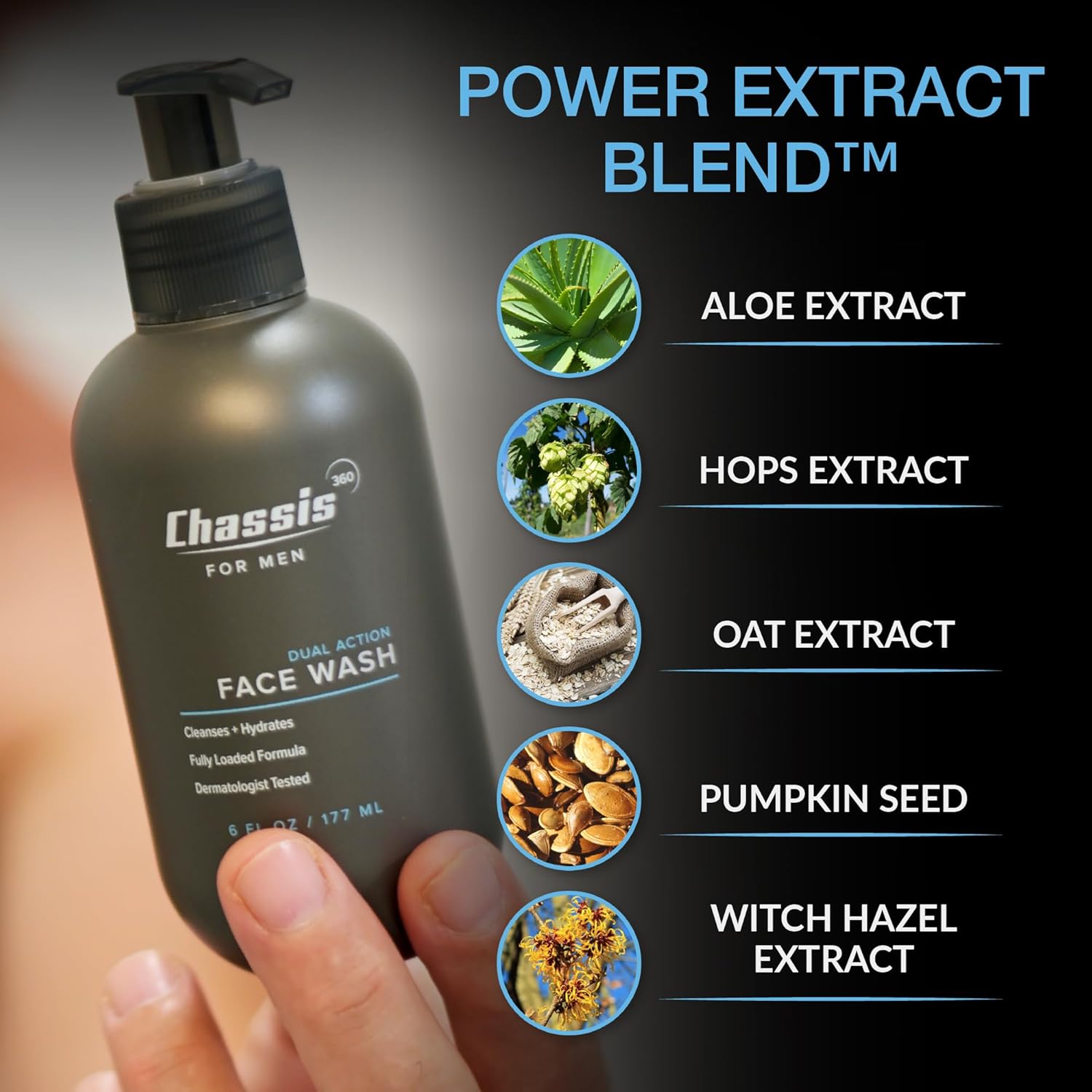 - SKIN-SAFE HYDRATION - Chassis 360 Dual Action daily face wash has been dermatologist tested to guarantee compatibility for all skin types. Free from irritating chemicals such as phthalates, parabens and sulfates, this is the perfect choice for a sensitive skin face wash, trusted by men who expect more from what they use daily.