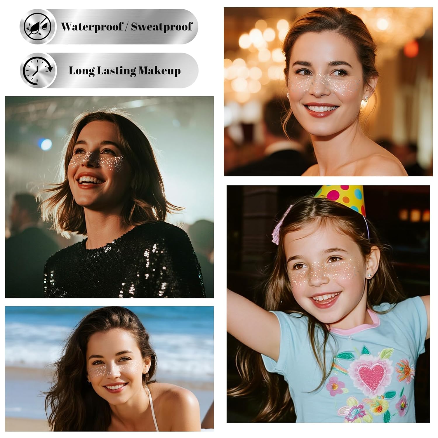 - 【Waterproof and Long-lasting Effect】: This face glitter freckles redefines beauty with its waterproof and sweat-proof function. Whether you are working out in the gym, pool parties, festivals, or rainy-day adventures, our sparkle freckles can stay flawlessly in place with vibrant color that lasts all day.