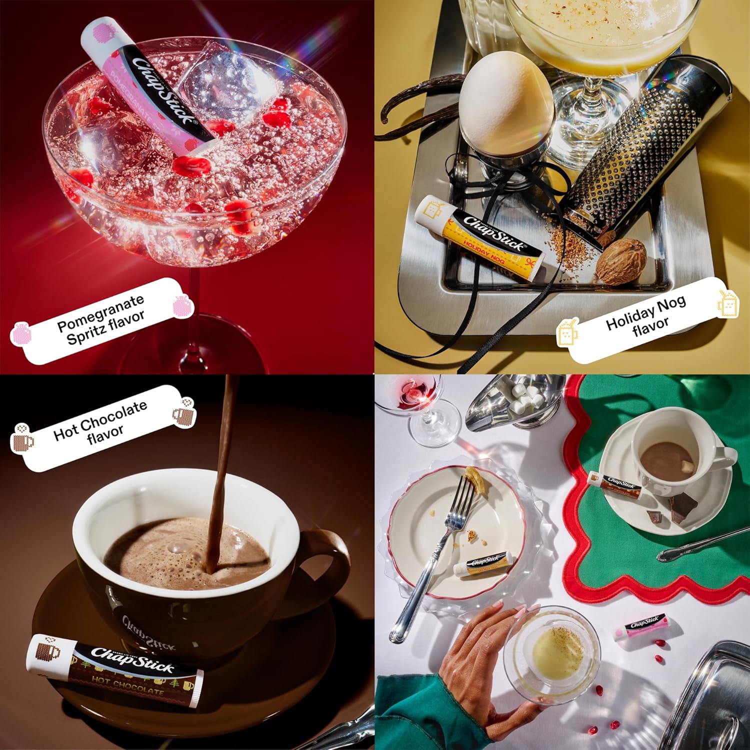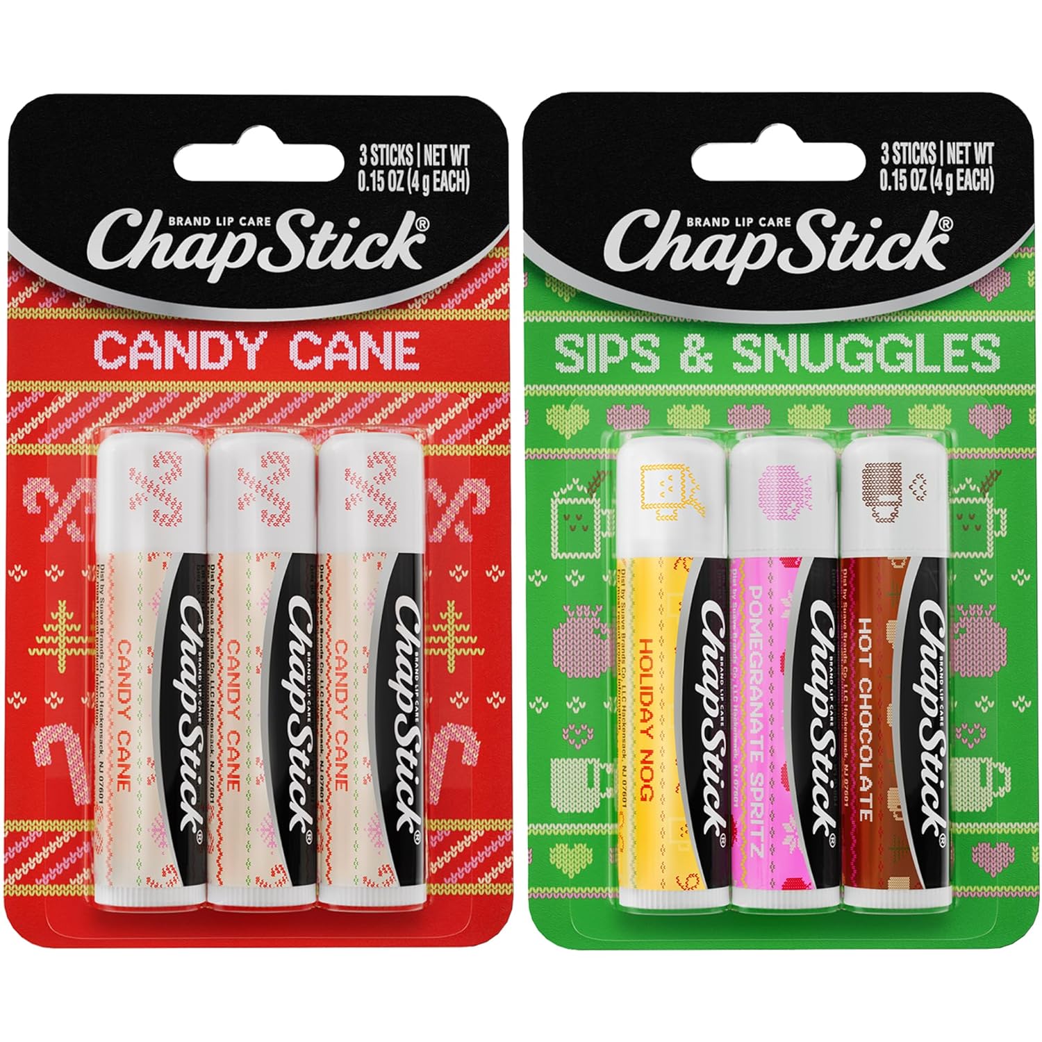 - CHAPSTICKS FOR GIFTING: Celebrate the season with a cozy collection of ChapStick packs: Candy Cane and Sips & Snuggles (Holiday Nog, Pomegranate Spritz, Hot Chocolate) in holiday-themed packaging.
