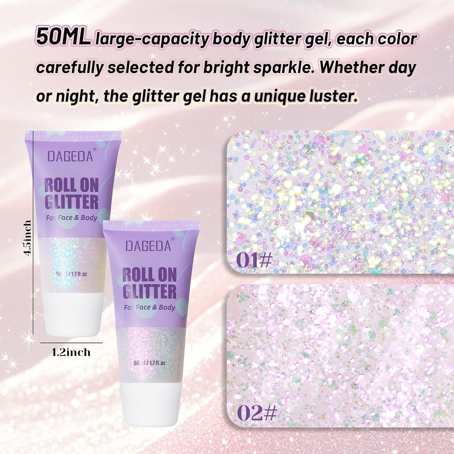 - Roll-on Glitter Design:No need to get your hands dirty or use other makeup tools—the roll-on design allows glitter gel to be applied evenly to your face and body.The tube design effectively controls the application of the glitter gel, creating a dazzling, sparkling look with just a simple swipe.
