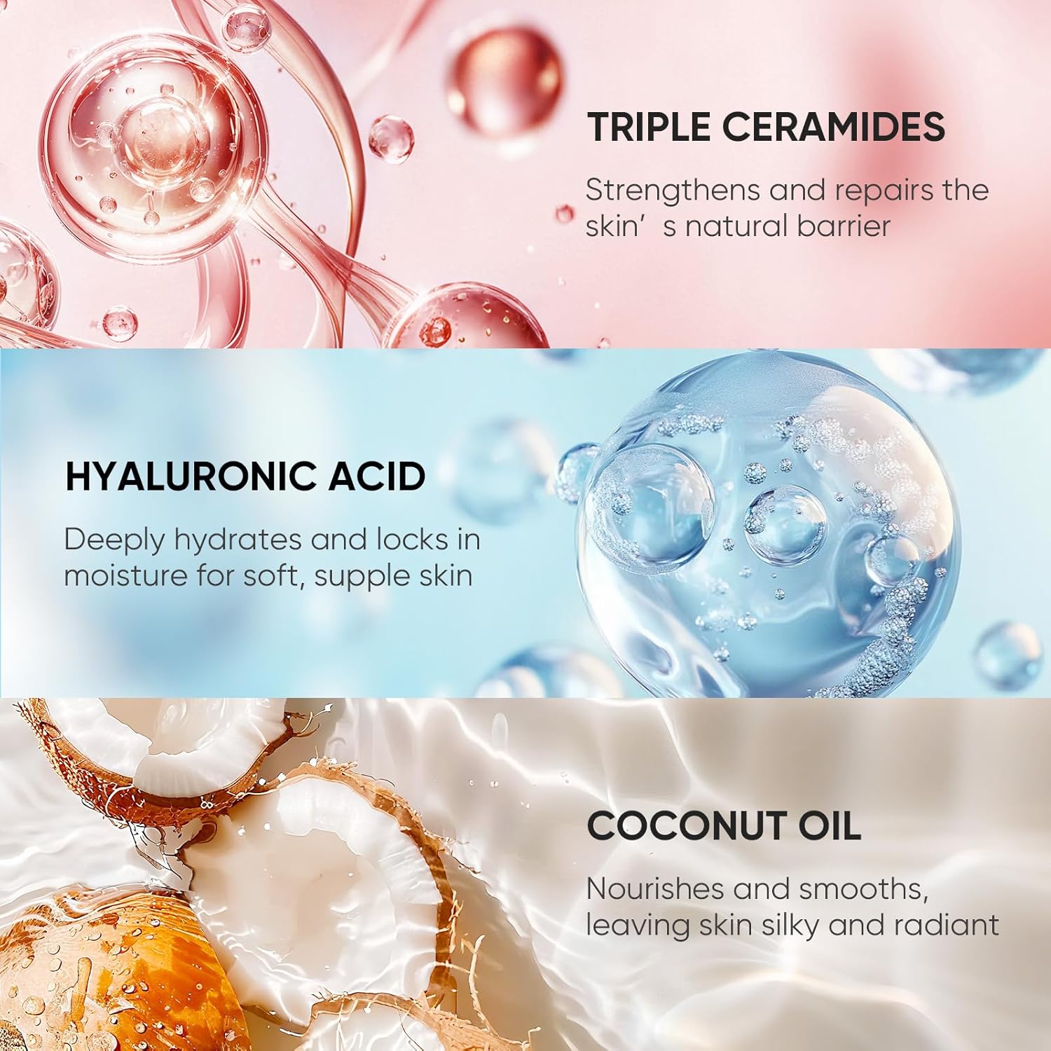 - Deep Moisturization: Enriched with hyaluronic acid, coconut oil, and ceramides to lock in moisture, leaving skin soft, smooth, and supple after every shower.