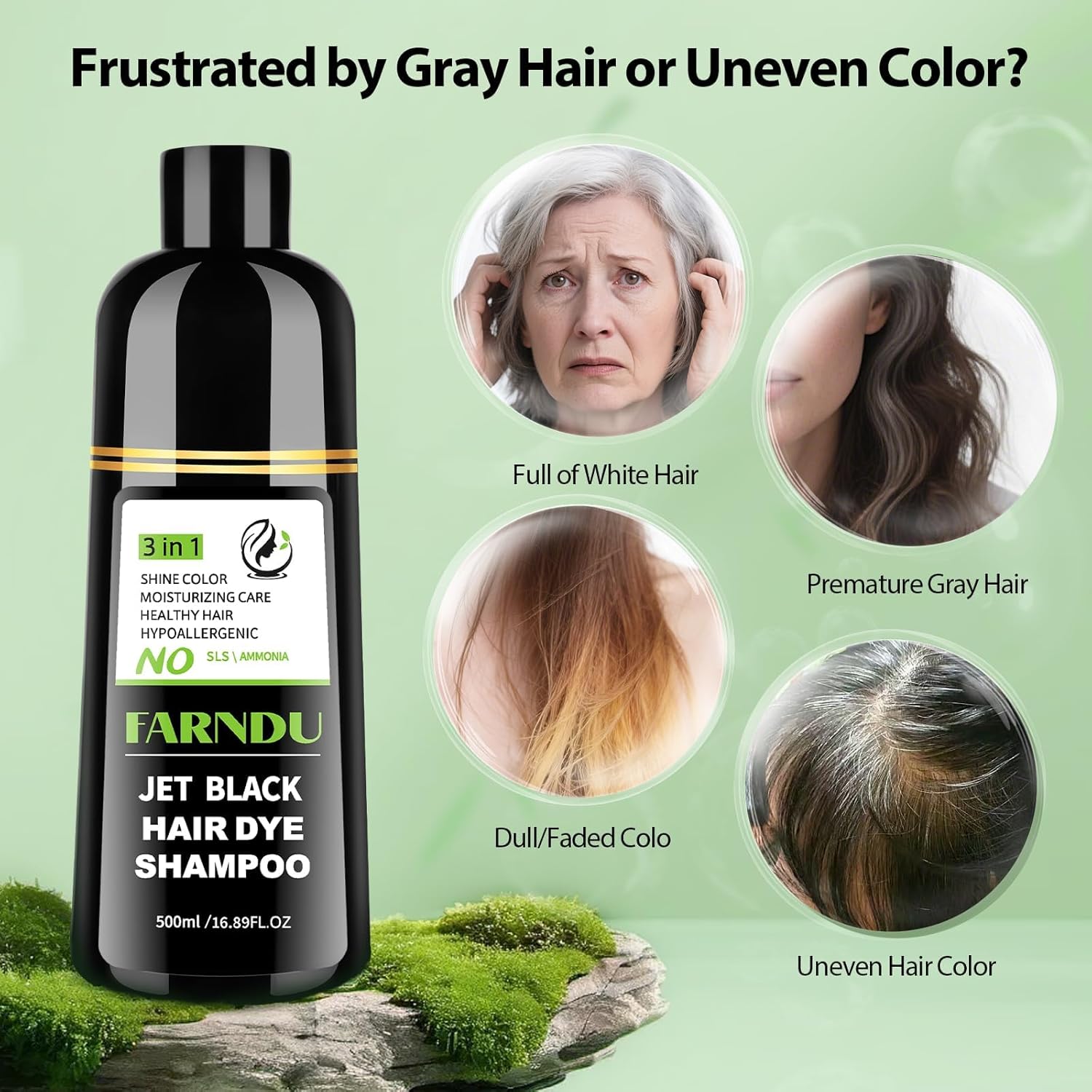 FARNDU Jet Black Hair Dye Shampoo for Women & Men, 3 in 1 Natural Herbal Color Shampoo for 100% Gray Coverage, Ammonia & Paraben Free (500ml)