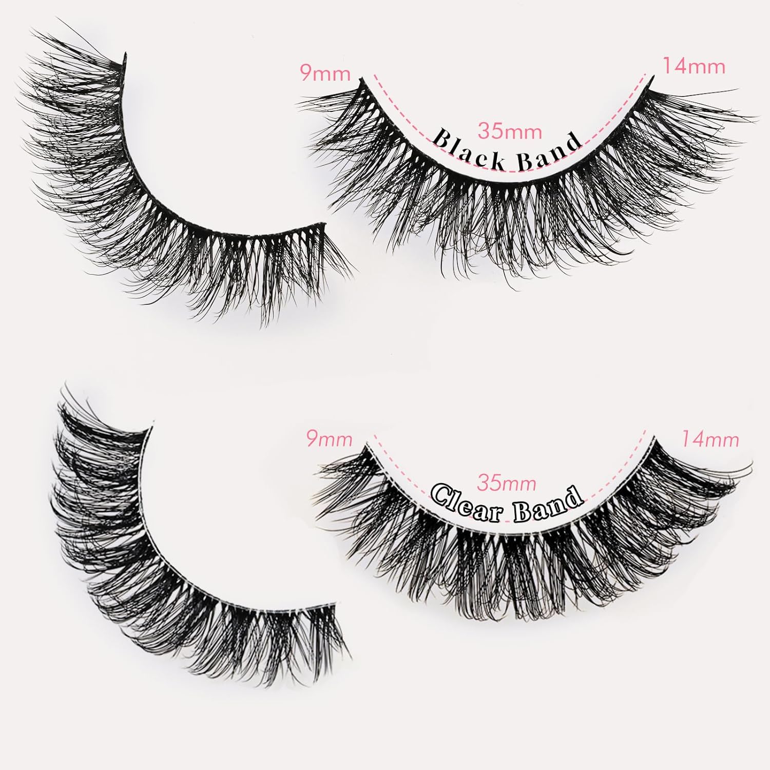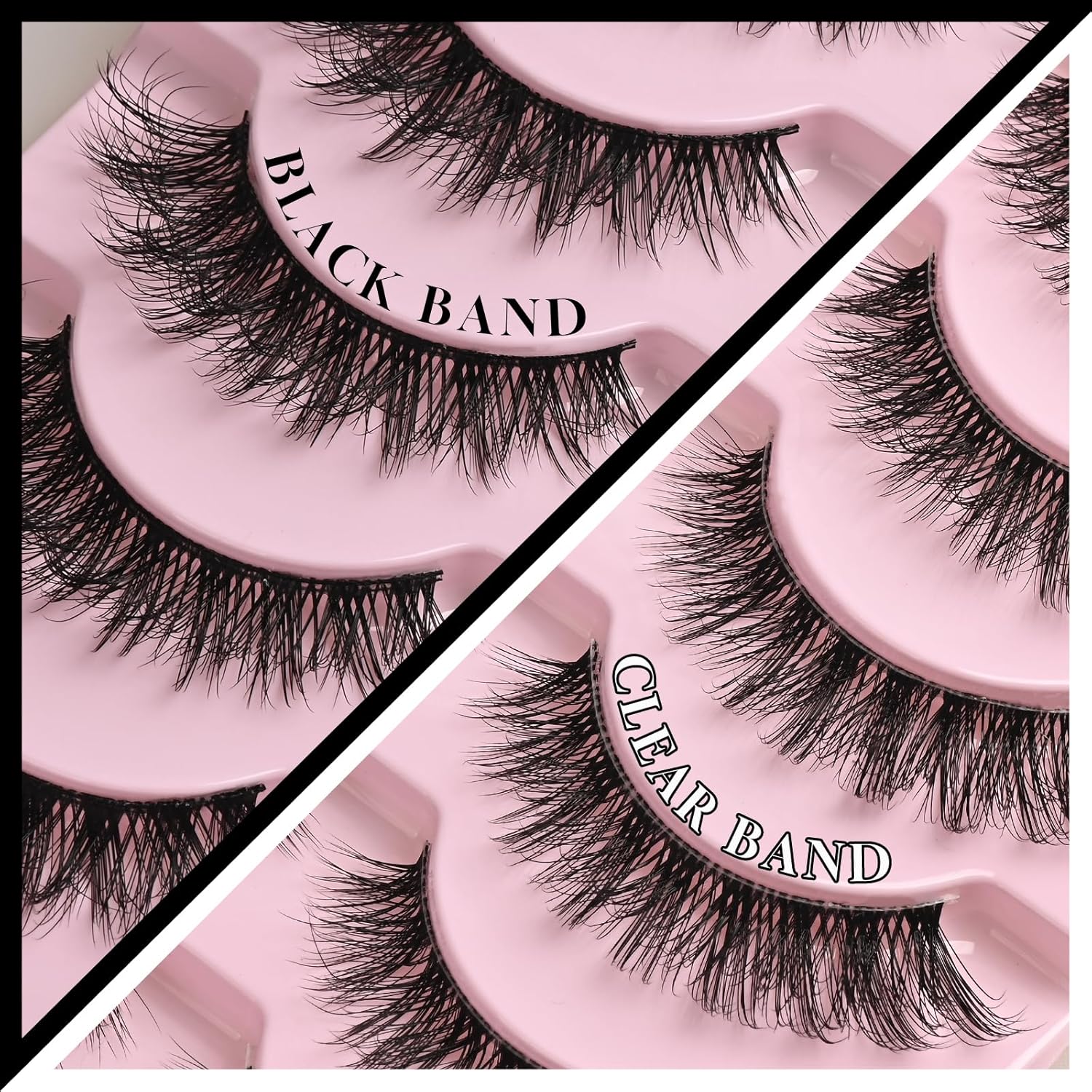 - Dual-Band Design: 7 Clear + 7 Black Pairs This exclusive set combines 7 clear-band lashes for a soft, invisible blend and 7 black-band lashes for a bolder, defined look—perfect for switching between natural daytime beauty and evening glam