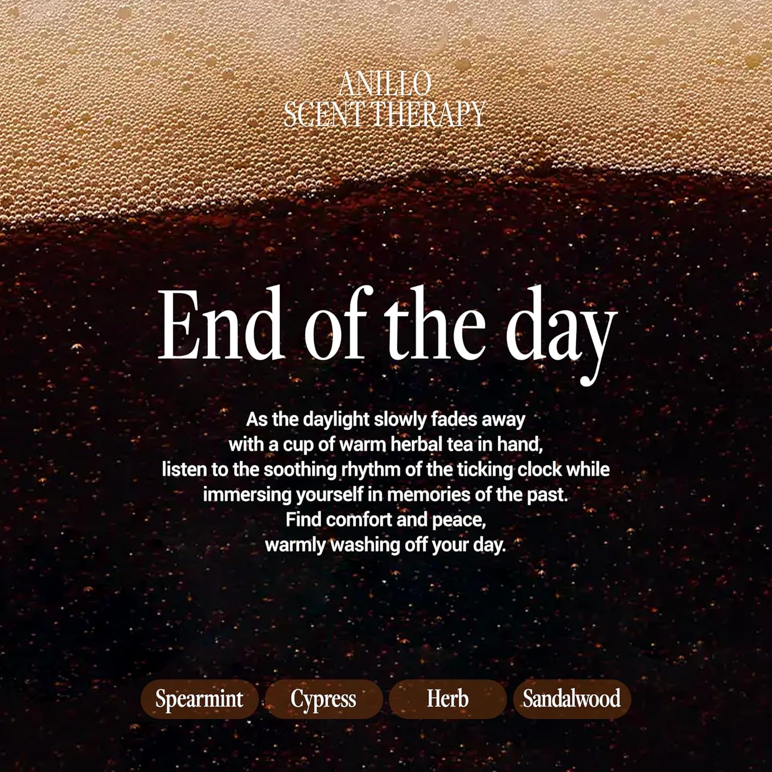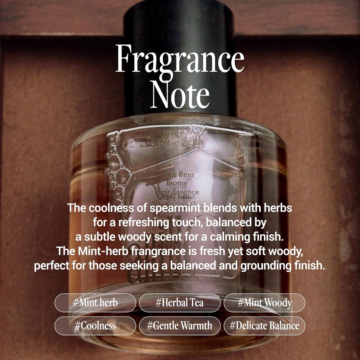 - MINT, HERB & GENTLE WOODS. Infused with a cool blend of Spearmint, Cypress, Herb and Sandalwood, this hair serum essence calms the mind and leaves a fresh, clean feeling. The scent lingers softly for a relaxing, refreshing finish. Apply evenly through mid-lengths and ends on damp or dry hair as needed.