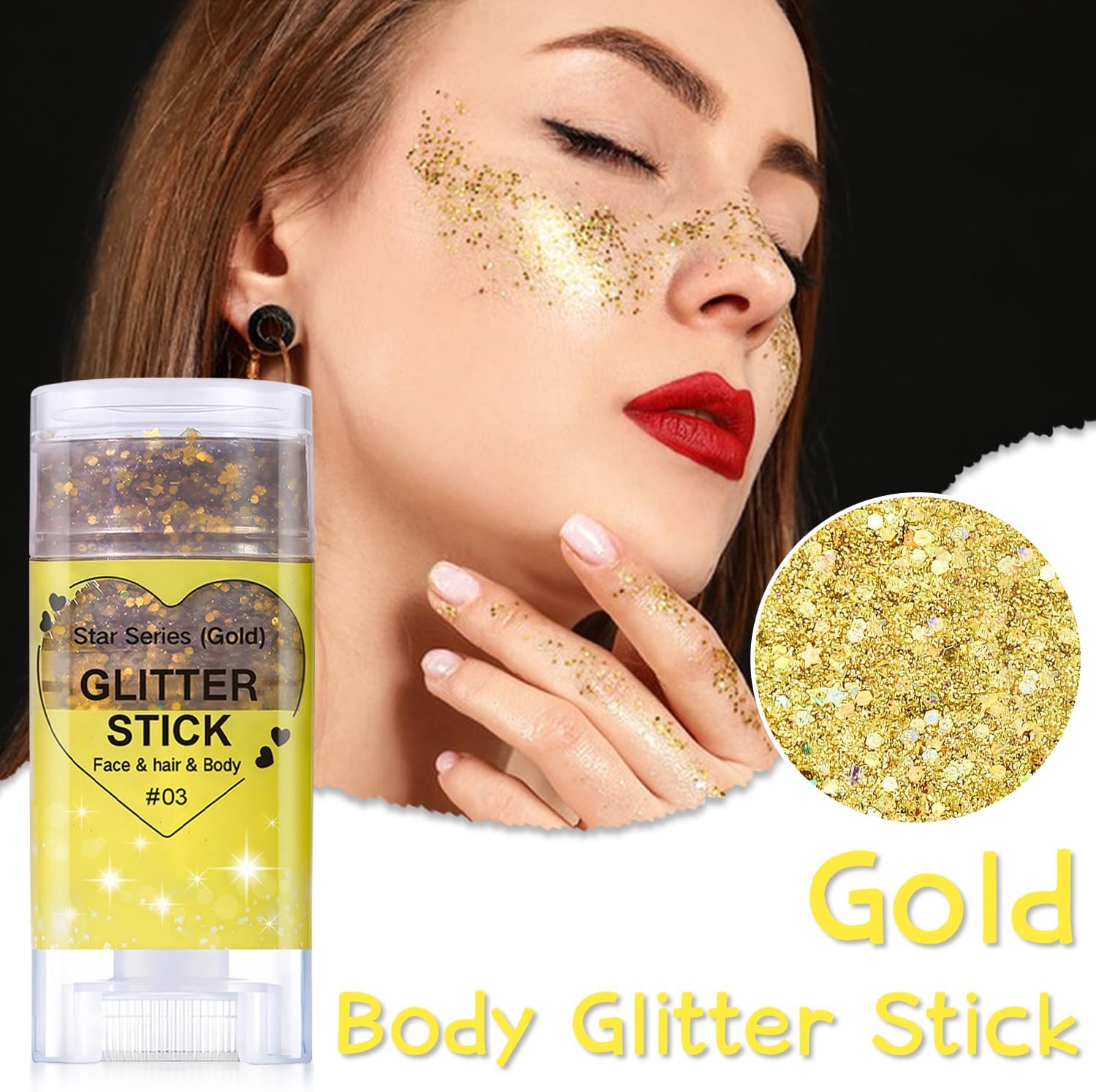 Gold Body Glitter Stick, Halloween Face Glitter Makeup,Holographic Hair Glitters Mermaid Makeup Rave Outfits for Women, Shimmer Face Paint Stick for Christmas (Gold)