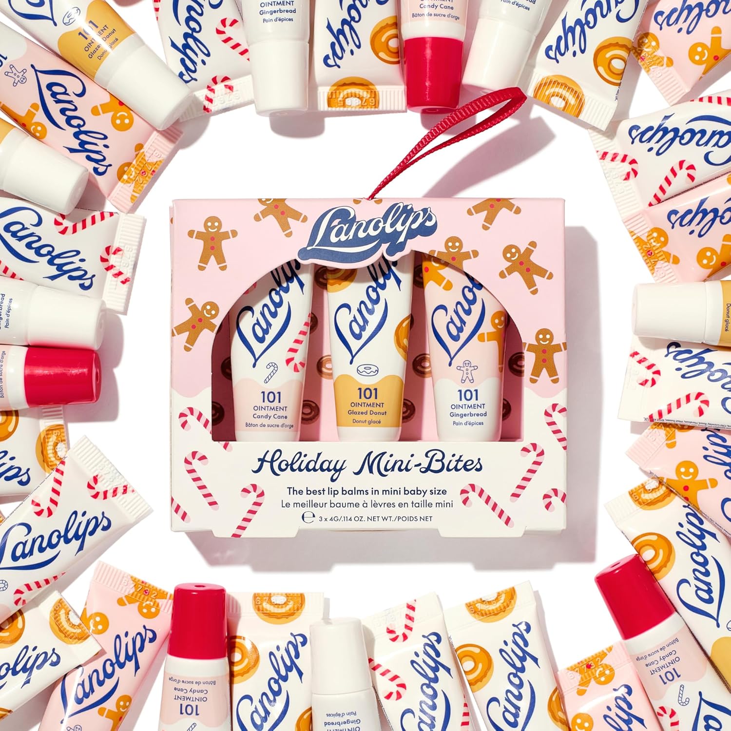 Lanolips Holiday Mini Bites Gift Set - Includes 101 Ointment Lanolin Lip Balm in Candy Cane, Glazed Donut & Gingerbread - Limited Edition Lanolin Holiday Gifts (3 Pieces)