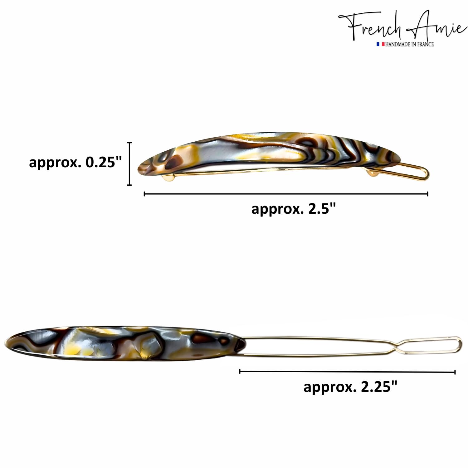 French Amie Narrow Oblong Small 2 1/4" Celluloid Acetate Set of 2 Side Slide In Hair Clip Barrettes with Tige Boule Clasp for Girls and Women, Made in France (Onyx Silver Grey)