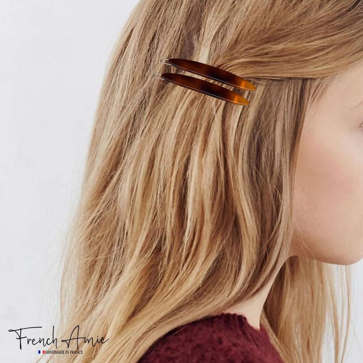 French Amie Narrow Oblong Small 2 1/4" Celluloid Acetate Set of 2 Side Slide In Hair Clip Barrettes with Tige Boule Clasp for Girls and Women, Made in France (Shell)