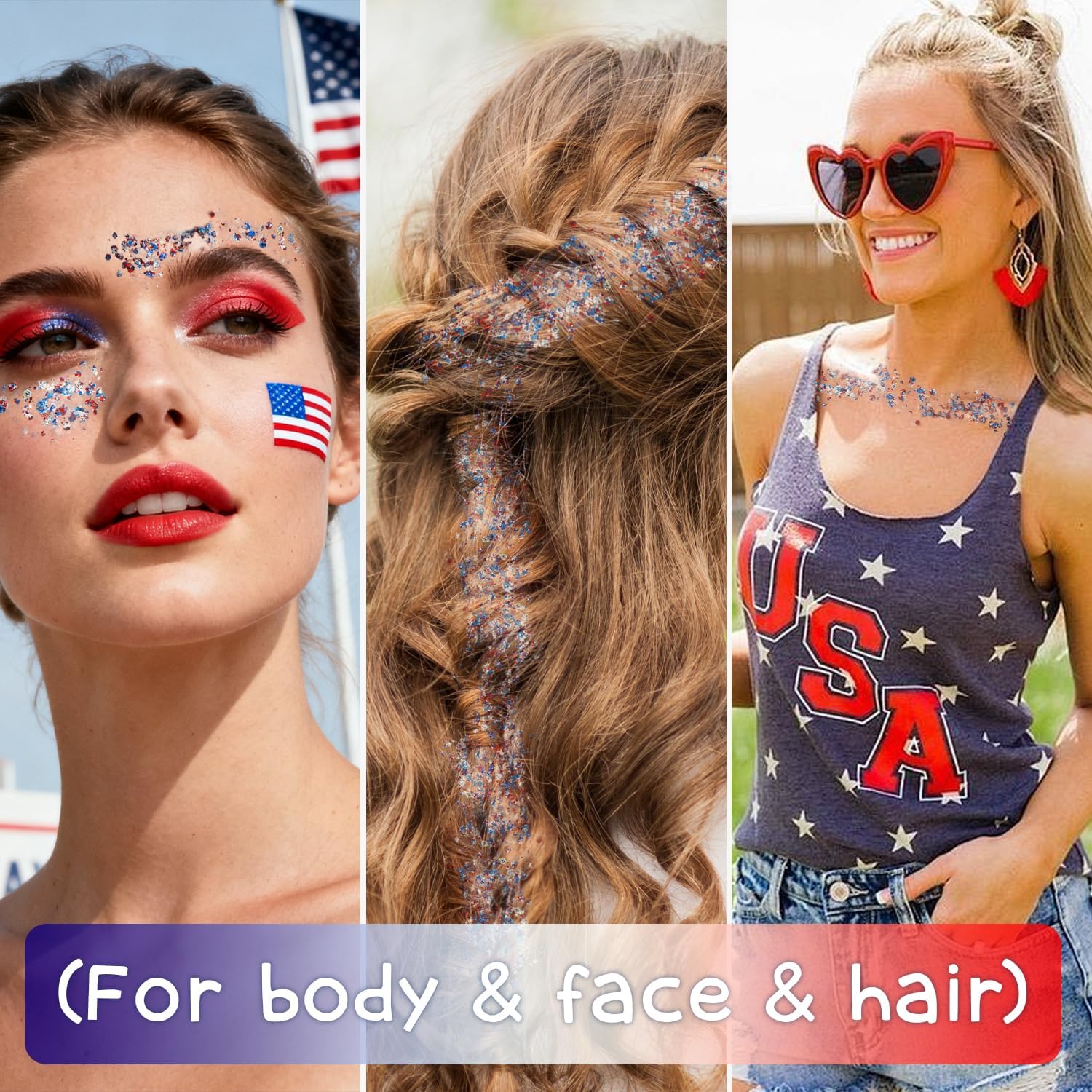 Patriotic Body Glitter Stick, Waterproof Face Glitter Gel, Chunky Glitter Face Paint, 4th of July Red White Blue Sequin Hair Glitter Makeup for American Pride USA Flag Makeup for Independence Day