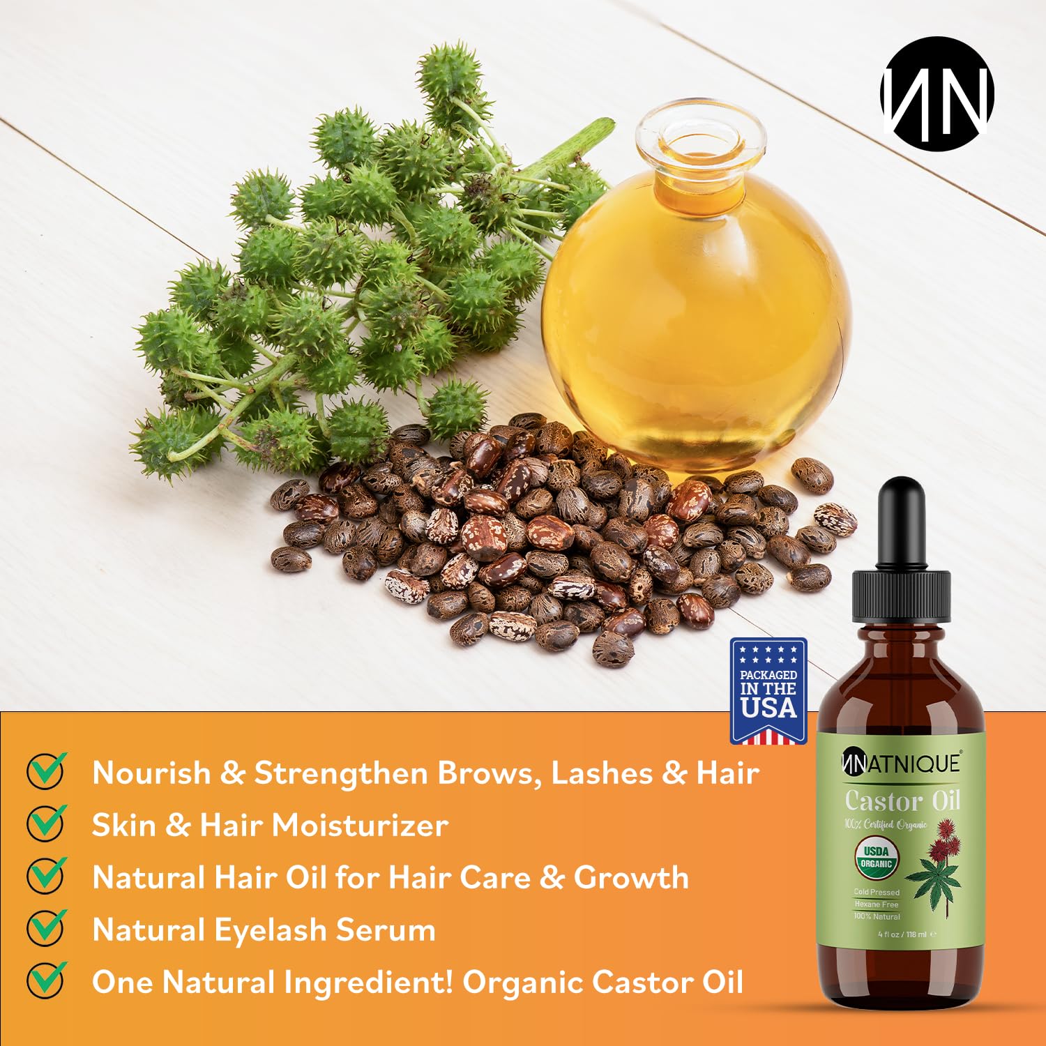 Natnique Castor Oil 4oz – USDA Certified Organic, 100% Pure Cold Pressed Unrefined Oil for Hair Growth, Eyelashes, Eyebrows & Scalp – Natural Skin Moisturizer, Lash Serum & Hair Treatment