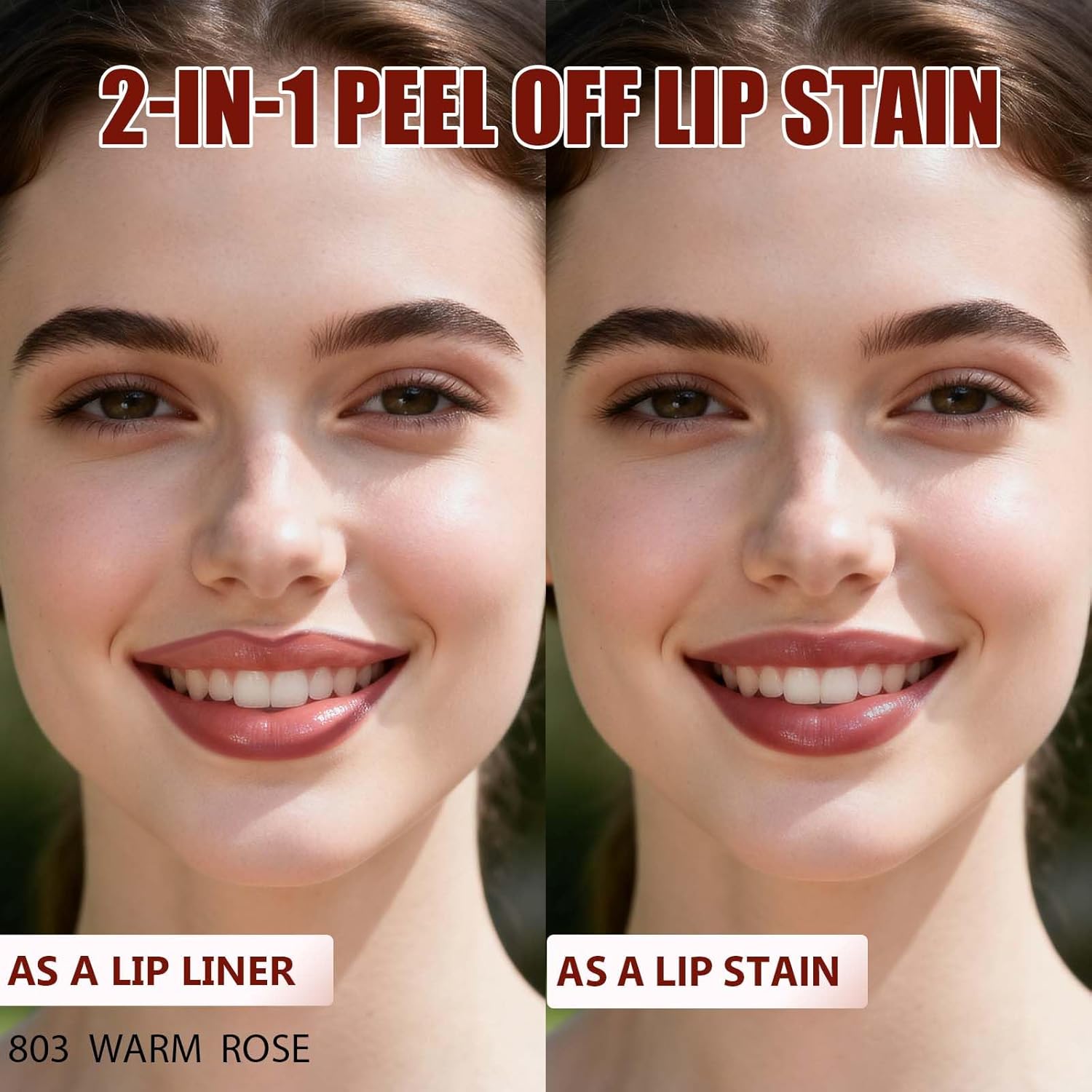 Lip Liner Stain Peel Off with Tweezer, Long Lasting Matte Lip Tattoo, Highly Pigmented Color Lip Makeup, Waterproof, Transfer-proof Lipstain for Women, WARM ROSE