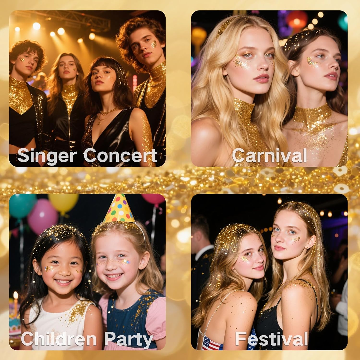 - SAFE & SKIN-FRIENDLY FORMULA:Made with a gentle gel base, gold face glitter is skin-friendly and non-irritating, ensuring a comfortable experience for all skin types-perfect for kids’ parties, school events, or Halloween costumes