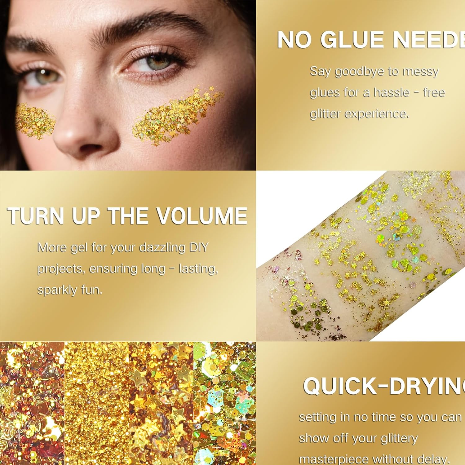 - VERSATILE FOR ANY OCCASION :Perfect for face, hair, and body, this gold glitter gel is great for festivals, parties, cosplay, raves, performances, and more.Whether you want a subtle glow or a bold, sparkling effect, it's your must-have for creative makeup looks