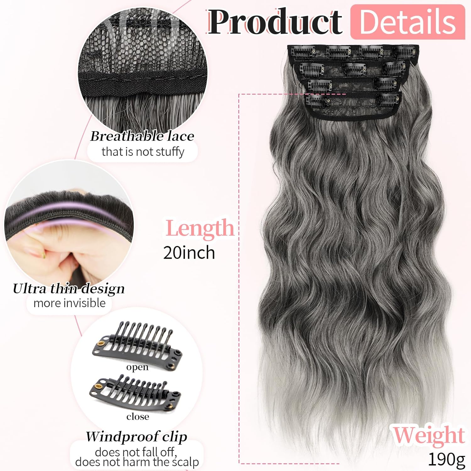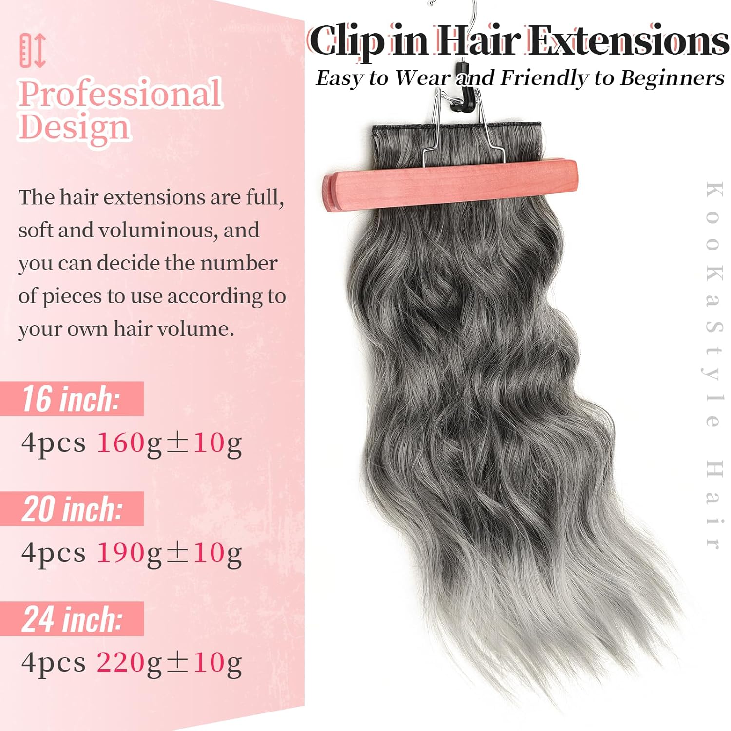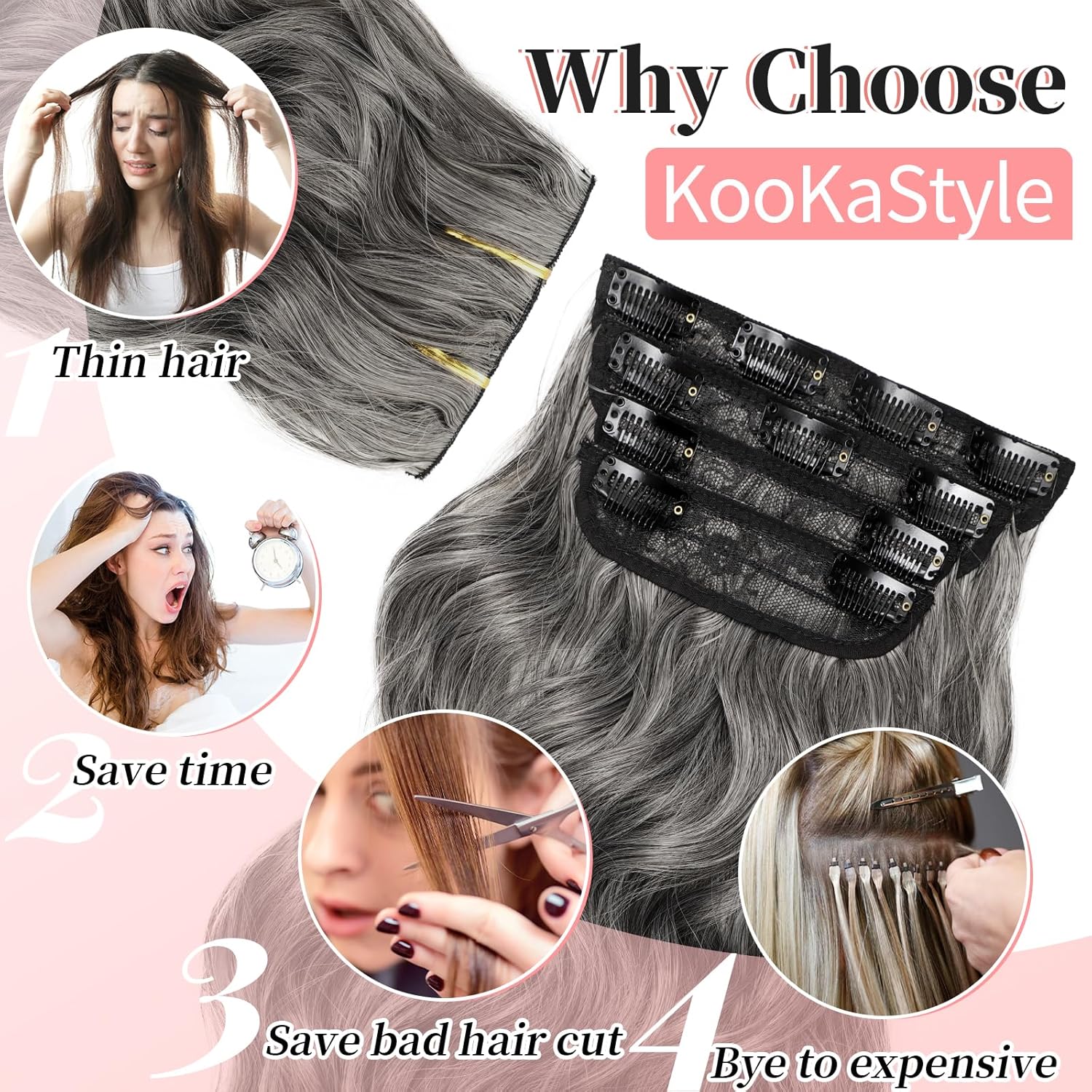 KooKaStyle Clip in Synthetic Hair Extensions Long Wavy 4PCS Thick Hairpieces Grey Sliver Mixed Fiber Double Weft Natural Hair Extensions 20 Inch for Women